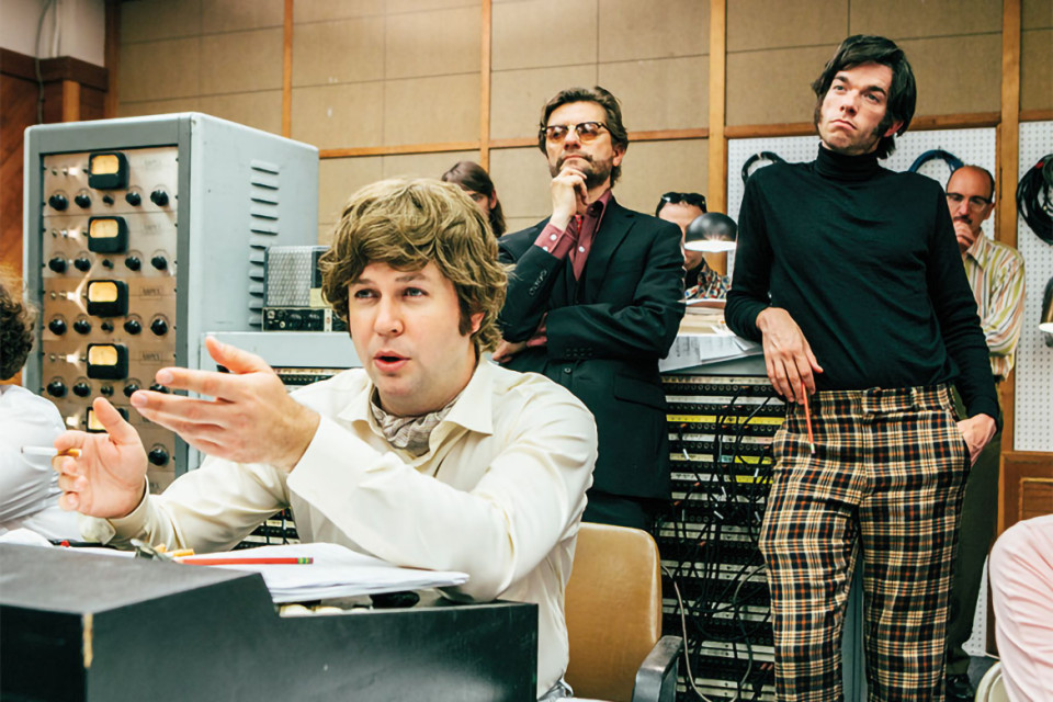 In the episode “Original Cast Album: Co-Op,” Documentary Now! parodies the 1970 D.A. Pennebaker film about the recording of the cast album of Stephen Sondheim’s Company. John Mulaney (plaid pants), as the faux Sondheim, is joined by Taran Killam (front) and James Urbaniak.