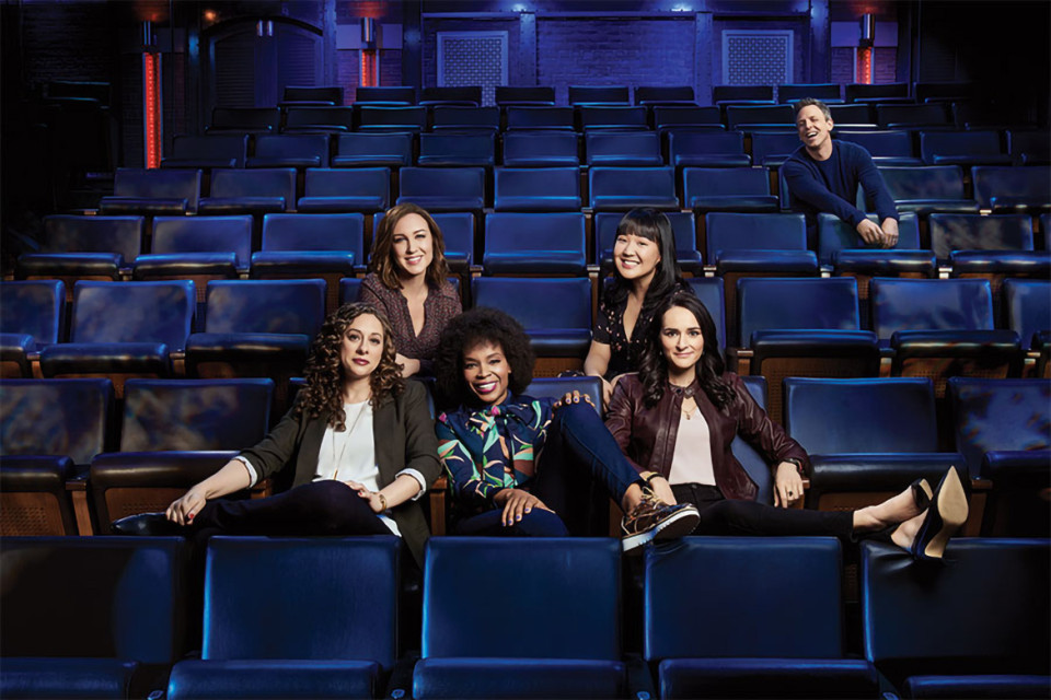 Seth Meyers with, from top left: Allison Hord, Karen Chee, (bottom) Jenny Hagel, Amber Ruffin, and Dina Gusovsky
