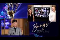 Justin Min presents the award for Outstanding Production Design For A Narrative Program to Amanda Serino and Andrew L. Jones for The Mandalorian on Night Three of the Creative Arts Emmys.