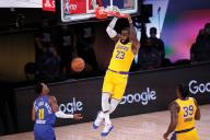 Monte Morris (11) of the Denver Nuggets and Dwight Howard of the L.A. Lakers look on as LeBron James (23) dunks in a 2020 NBA conference final playoff game.