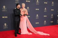 Brett Goldstein and Hannah Waddingham with their awards for Ted Lasso at the 73rd Emmy Awards