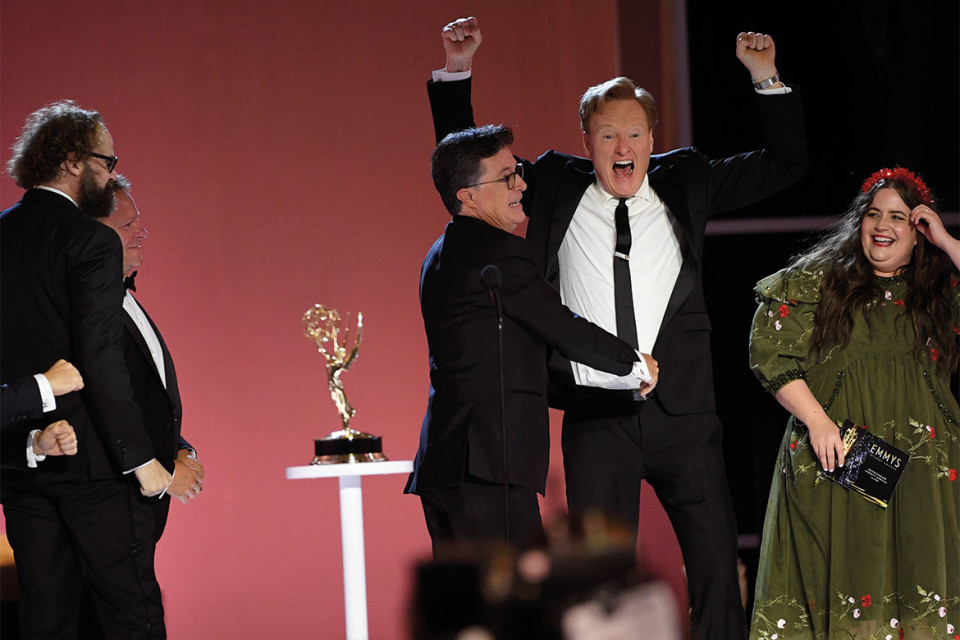Conan O’Brien is stoked for Stephen Colbert and the producers of Showtime’s Election Night 2020 special. Aidy Bryant presented the award to the team.