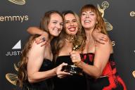 Angela Boisvert, Amanda Marie Pinedo, and Suzanne Mejean Pinney backstage after winning the Informational Series (more than 50% remote) Emmy for KCET's Graphic Design (Artbound) during the 74th Los Angeles Area Emmy Awards at the Television Academy Plaza on Saturday, July 23, 2022, in North Hollywood, California.
