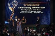 Stephanie Filo, Bradinn French and Taylor Joy Mason of A Black Lady Sketch Show accept the award for Outstanding Picture Editing for Variety Programming at the 2022 Creative Arts Emmy Awards.