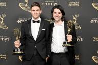 Oliver Latta and Teddy Banks of Severance backstage at the 2022 Creative Arts Emmy Awards.