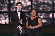 Freddie Highmore of The Good Doctor and Chandra Wilson of Grey's Anatomy present an award for Outstanding Supporting Actress in a Limited or Anthology Series or Movie