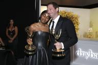 Ayo Edebiri and Ebon Moss-Bachrach backstage at the 75th Emmy Awards