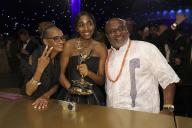 Ayo Edebiri from The Bear, Helen O'Neal Edebiri and Dele Edebiri at the 75th Emmy Awards Governors Gala