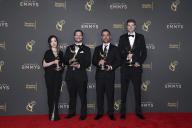 Nadia Tzuo, Alex Silver, Lee Buckley and Evan Larimore backstage with their award for Outstanding Main Title Design for Shōgun at the 76th Creative Arts Emmy Awards