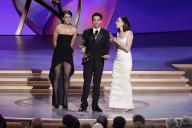 Jen Statsky, Paul W. Downs and Lucia Aniello of Hacks accept the award for Outstanding Writing for a Comedy Series at the 76th Emmy Awards