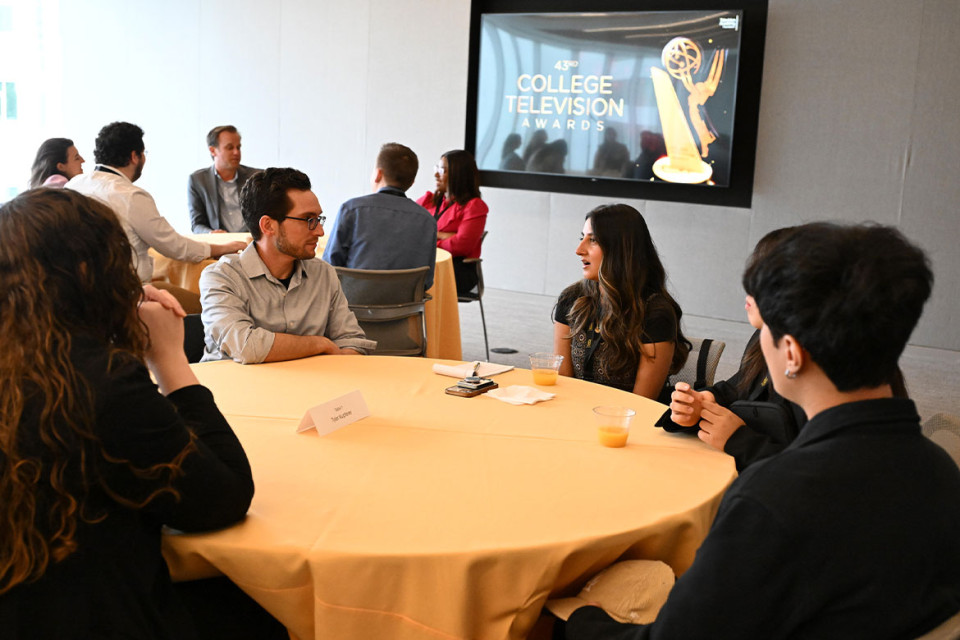 Tyler Kupferer, layout supervisor for Walt Disney Animation Studio, meets with 2024 College Television Awards Nominees at the Networking Breakfast.