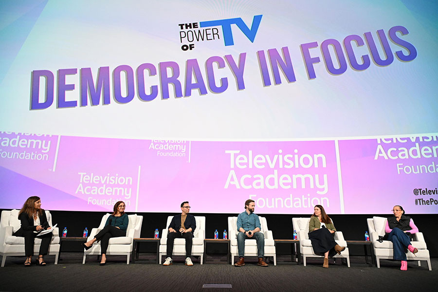 Reuters journalist Dawn Chmielewski moderates the Television Academy Foundation's "The Power of TV: Democracy in Focus" panel with participants Valentina Garza (writer/EP, The Simpsons), Mark Goffman (writer/EP, The Umbrella Academy), Will Jenkins (director, Partnership for Public Service), Amanda McBaine (writer/director/producer, Girls State) and Michelle Visage (producer, RuPaul's Drag Race)