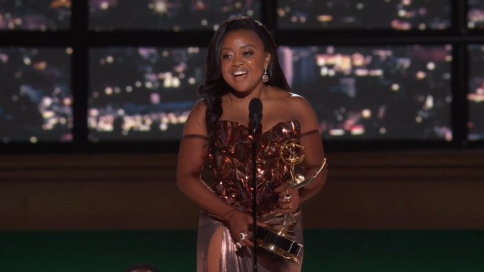Quinta Brunson accepts the Emmy for Writing for a Comedy Series for Abbott Elementary at the 74th Emmy Awards.