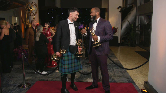 Richard Gadd of Baby Reindeer talks to Albert Lawrence backstage at the 76th Emmy Awards after winning the Emmy for Outstanding Limited or Anthology Series.