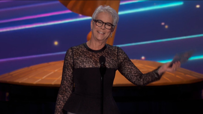 Jamie Lee Curtis accepts the Emmy for Outstanding Guest Actress in a Comedy Series at the 2024 Creative Arts Emmy Awards.