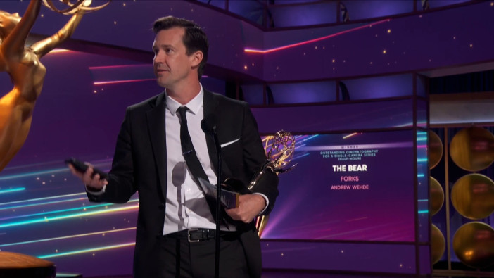 Andrew Wehde accepts the Emmy for Outstanding Cinematography For A Single-Camera Series (Half-Hour) at the 2024 Creative Arts Emmy Awards.