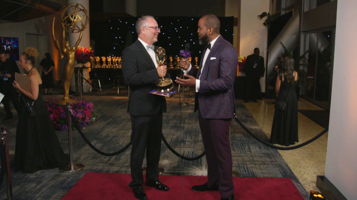The team from Shōgun talks to Albert Lawrence backstage at the 76th Emmy Awards after winning the Emmy for Outstanding Drama Series.