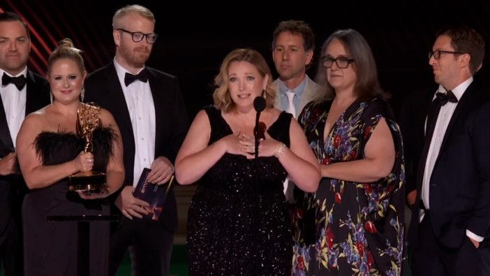 Lindsey Cash and Andrew Colon accepts the Emmy for Commercial for Teenage Dream - Sandy Hook Promise at the 2022 Creative Arts Emmy Awards.
