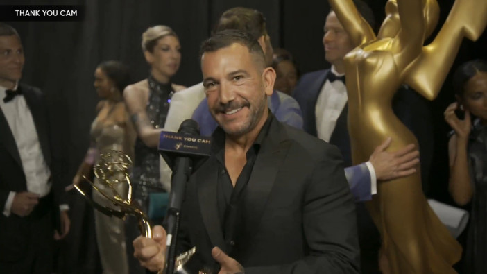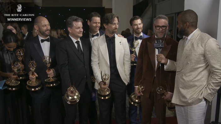 The team from The Studio talks to the Emmys Thank You Cam after winning Outstanding Comedy Series.
