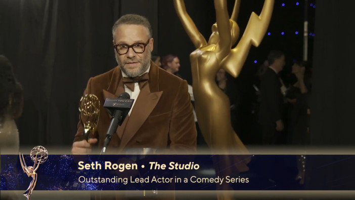Seth Rogen talks to the Emmys Thank You Cam after winning for Outstanding Lead Actor in a Comedy Series in The Studio.