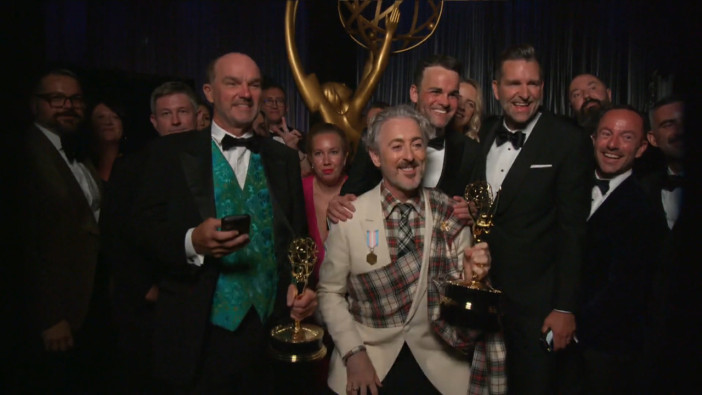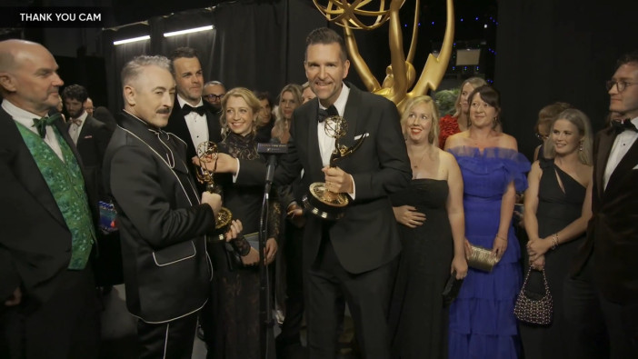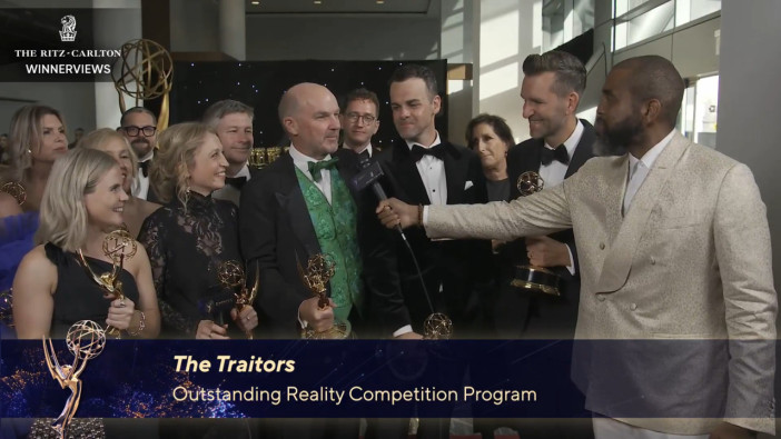 The team from The Traitors talks to the Emmys Thank You Cam after winning for Outstanding Reality Competition Program.