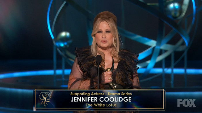 Jennifer Coolidge accepts the Emmy for Supporting Actress in a Limited or Anthology Series or Movie for The White Lotus at the 74th Emmy Awards.