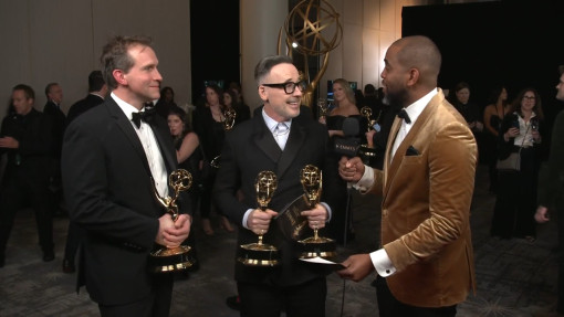 Will Smith from Slow Horses talks to Albert Lawrence backstage at the 76th Emmy Awards after winning the Emmy for Outstanding Writing for a Drama Series.